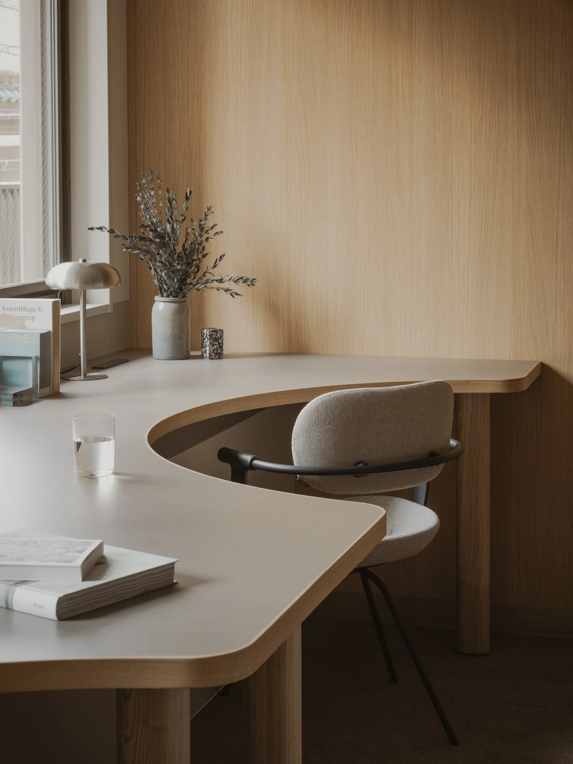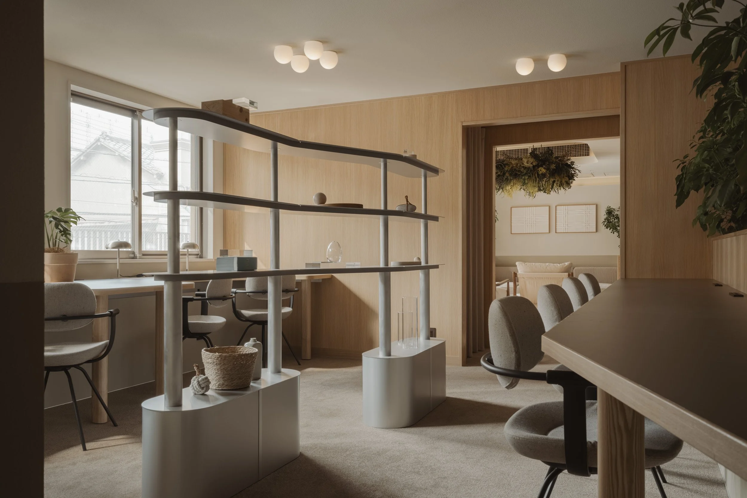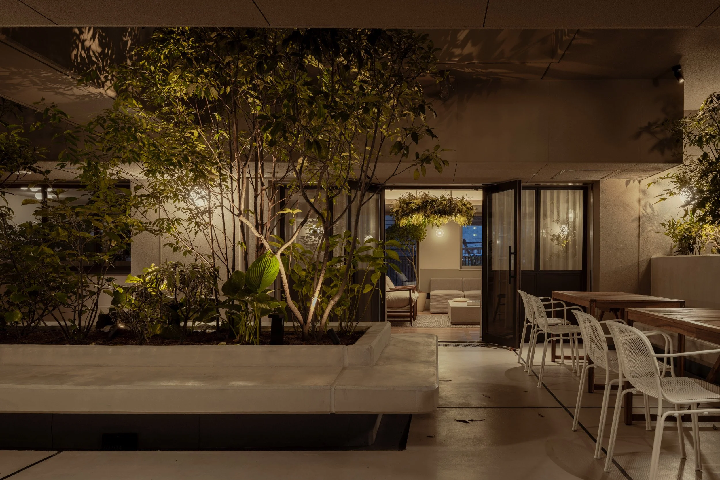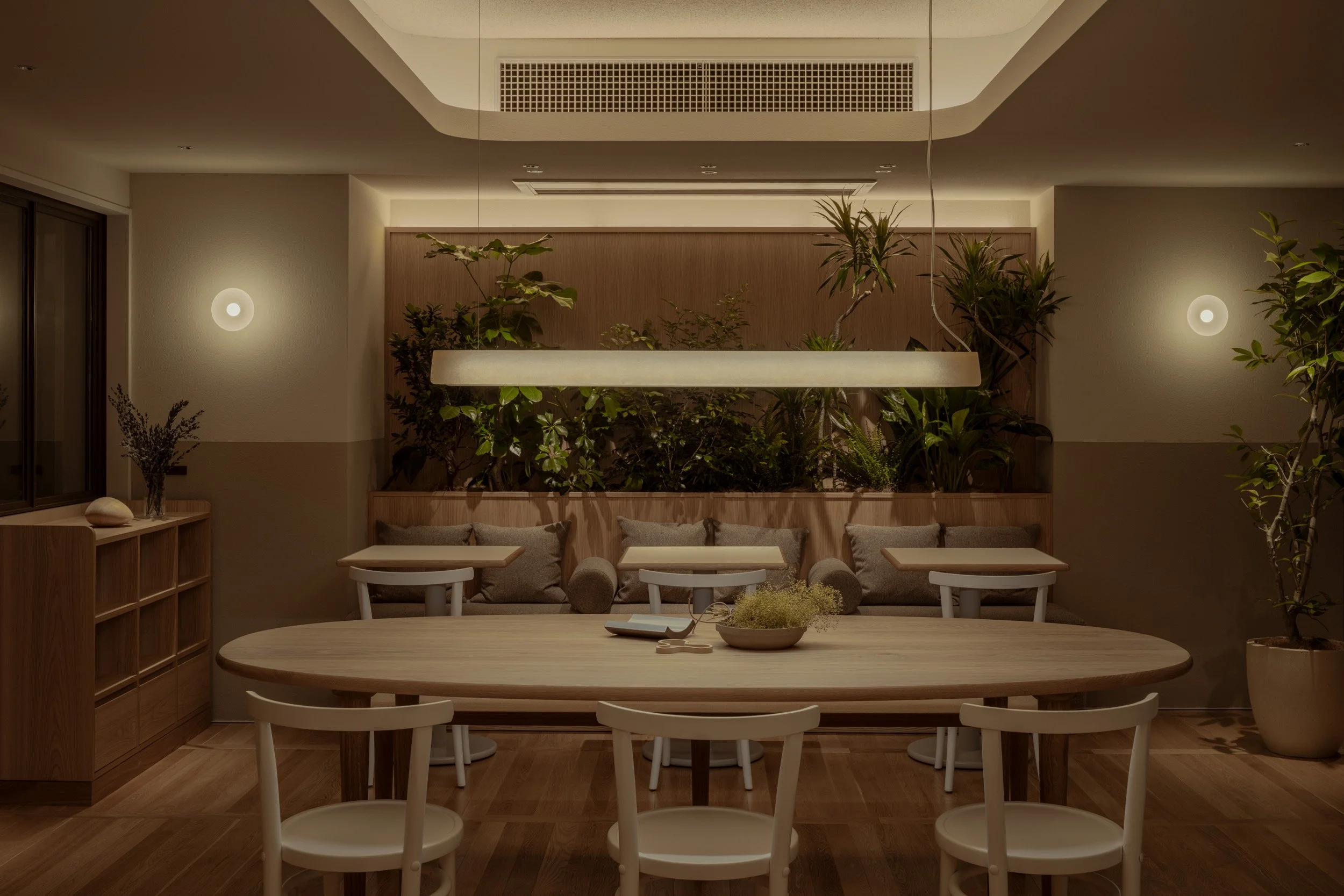 住まい手にとって真に快適な環境を追求し、「個人の時間」と「他者との緩やかな繋がり」のバランスを実際の空間に反映させました。専有部は自分らしい暮らしを表現できるミニマルな空間とする一方で、2階の共用部には、気分に合わせて選べるライブラリー、集中できるワークスペース、緑に包まれたセンターテラス、多彩なキッチンなどを配置しています。 また、インテリアには和紙や無垢材といった経年変化を楽しめる自然素材を多く採用し、朝の光から夜の落ち着いた明かりへと移ろう緻密な照明計画を実施。ホテルのような洗練と「家」としての安心感を両立させることで、日々過ごす場所への愛着が自然と育まれる空間構成を実現しています。